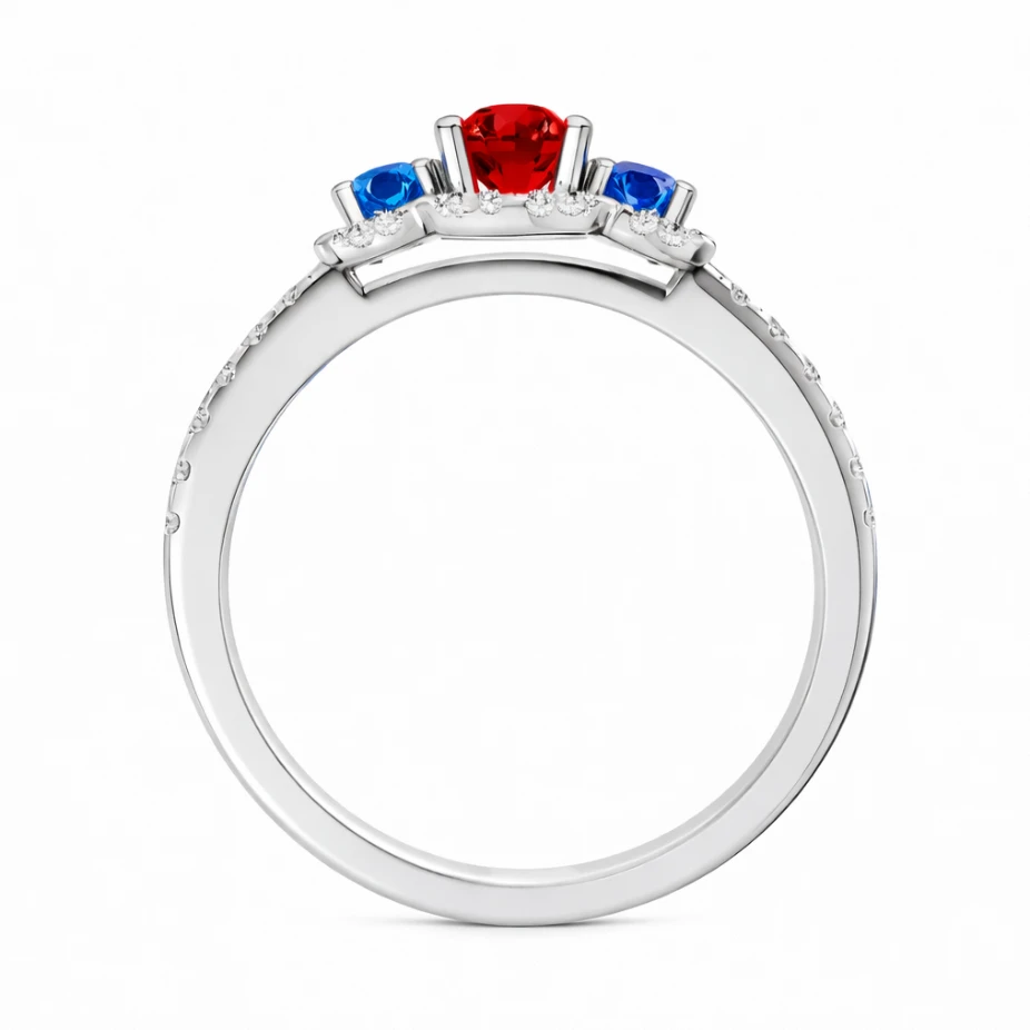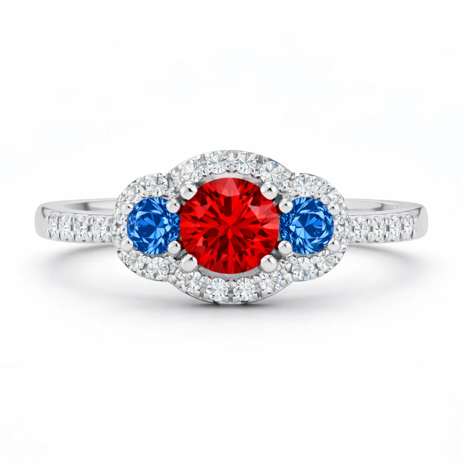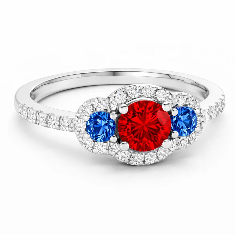 At its center lies a vivid red gemstone, radiating warmth and intensity. Flanking it on both sides are deep azure blue gemstones, creating a bold yet balanced composition that feels both modern and timeless.