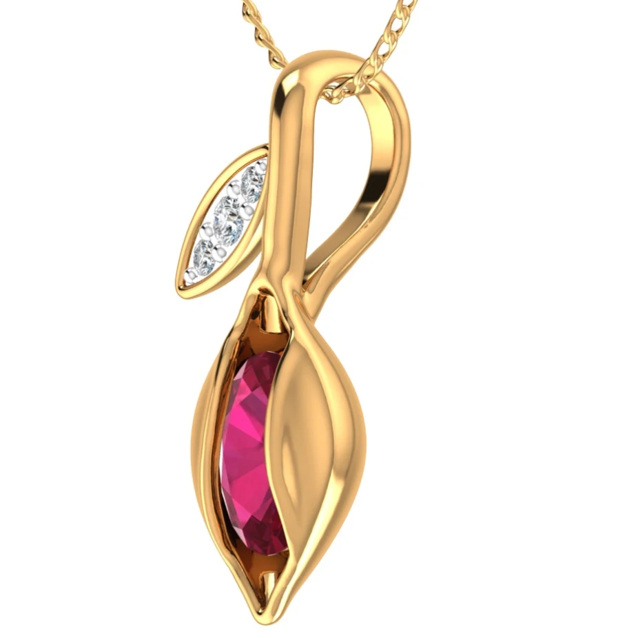 Inspired by the tender bloom of nature, this 18K gold pendant is a graceful expression of art and emotion. At its heart rests a vibrant, premium red oval-cut gemstone nestled within sculpted gold petals, symbolizing beauty in its most organic form. A delicately crafted leaf motif glistens with Celestial Diamonds — our signature lab-grown melee diamonds — adding a hint of sparkle to this botanical treasure.