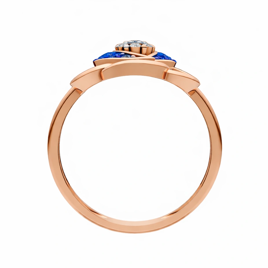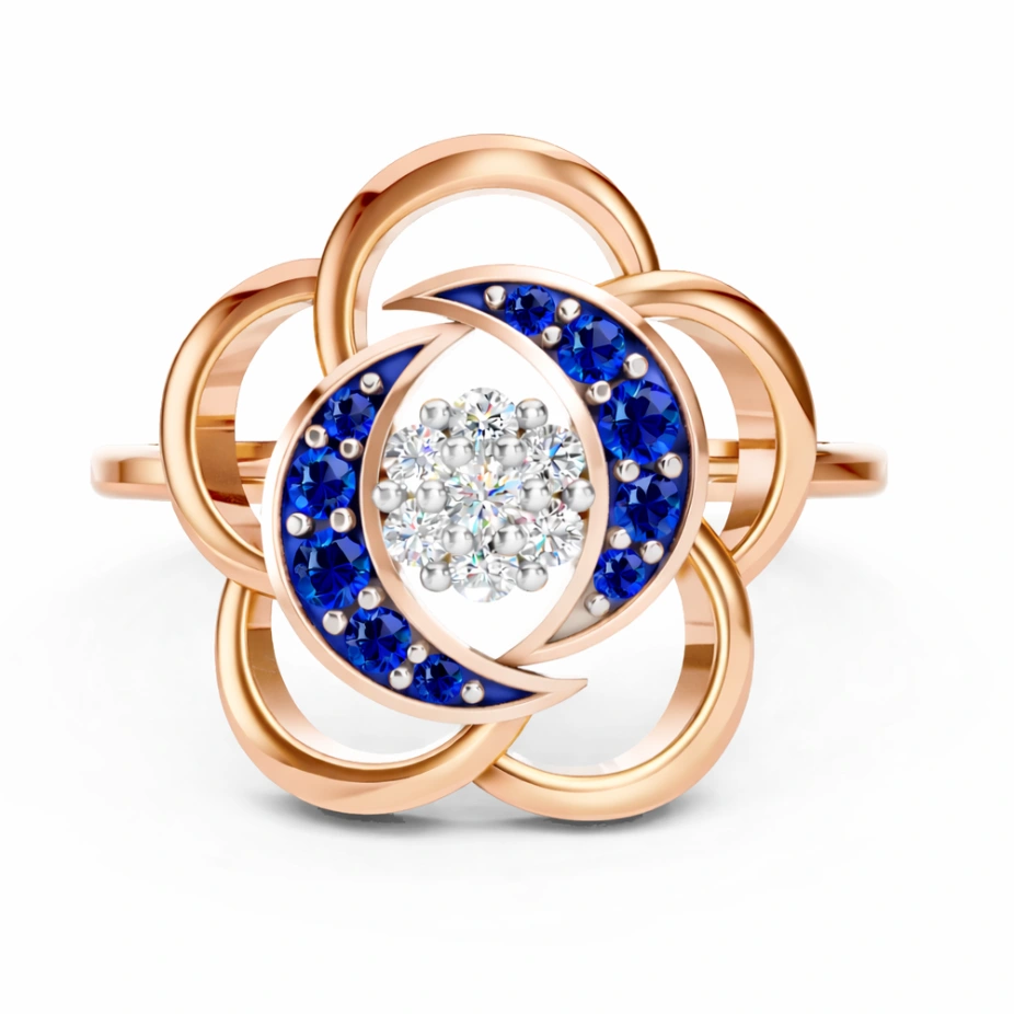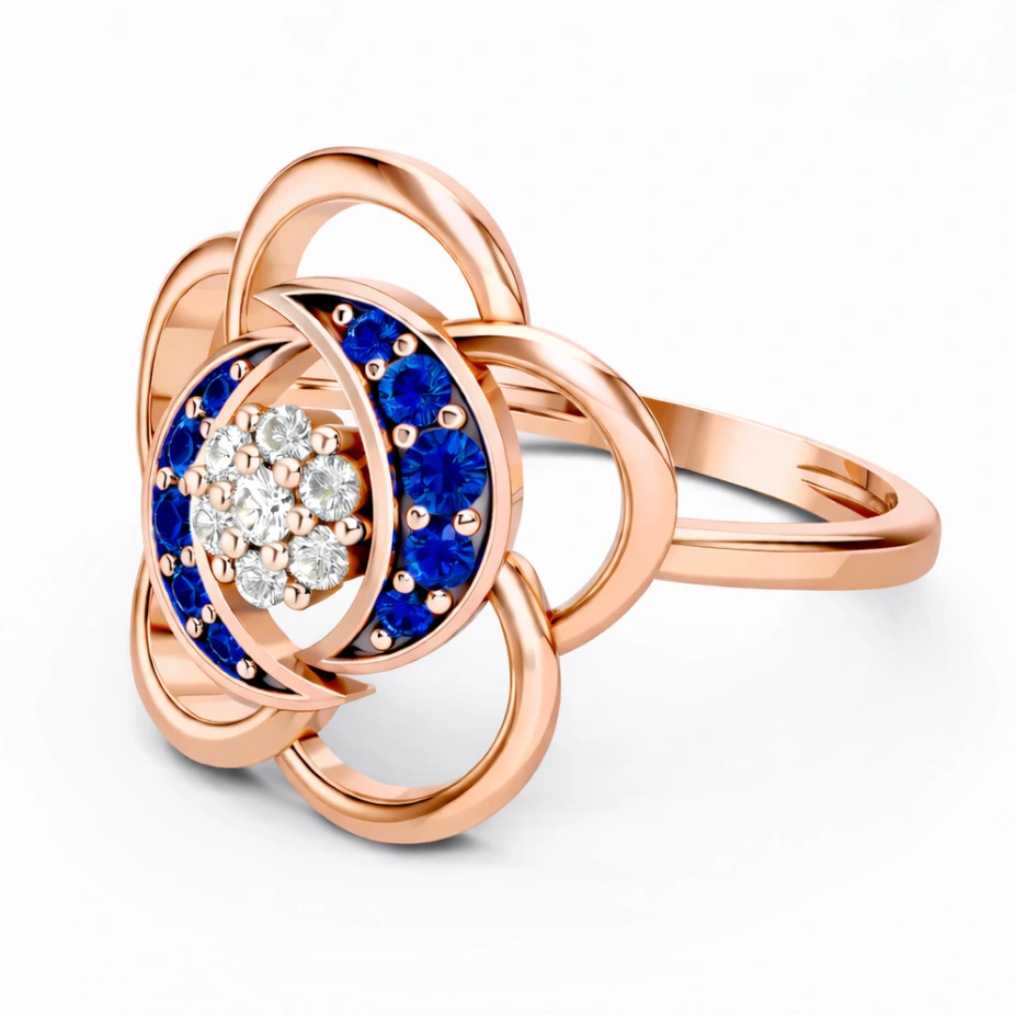 The Eclipse Diamond Ring is a striking fusion of motion and brilliance, crafted in luxurious 18k rose gold. Inspired by celestial alignment, this statement ring features an orbit-inspired design where fluid gold loops encircle a radiant cluster of Celestial Diamonds at the center. Deep blue accent stones trace the inner arc, creating a dramatic contrast against the warmth of rose gold and the sparkle of perfectly cut diamonds.