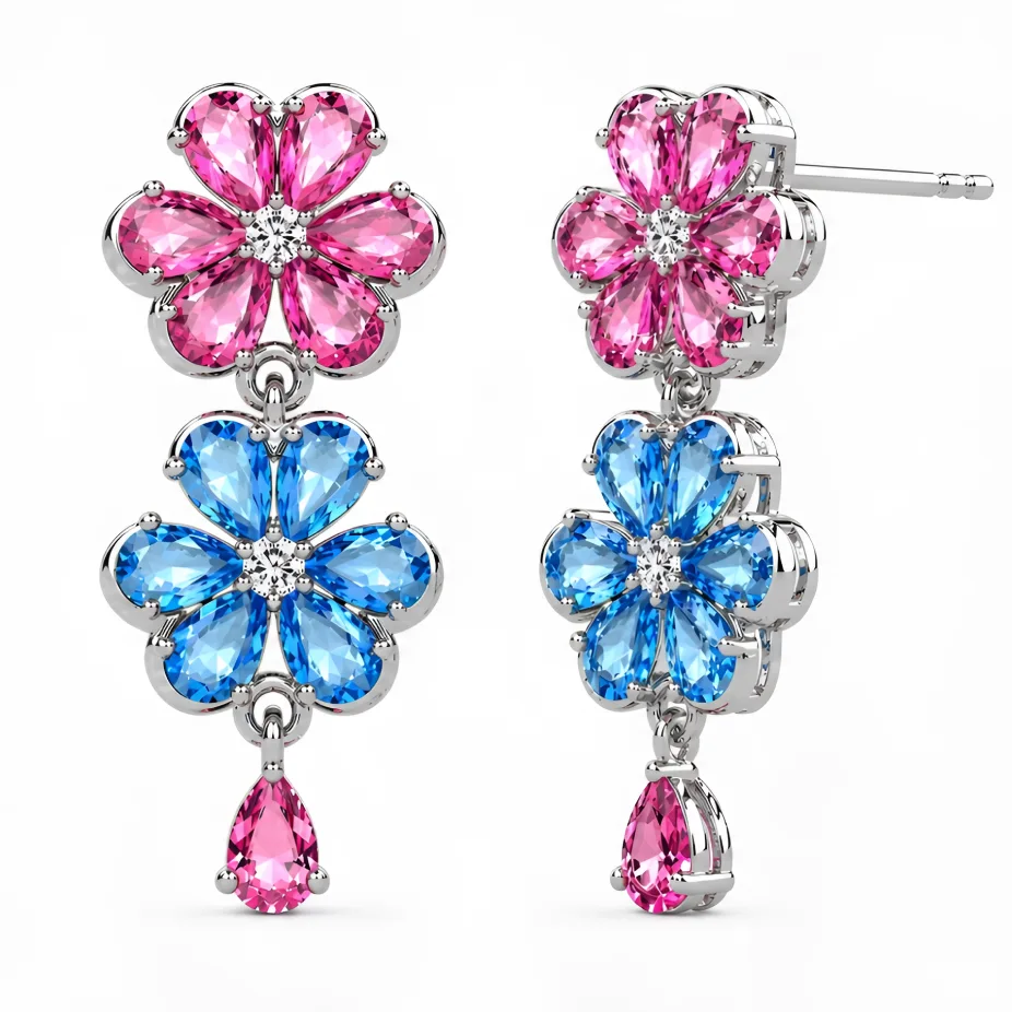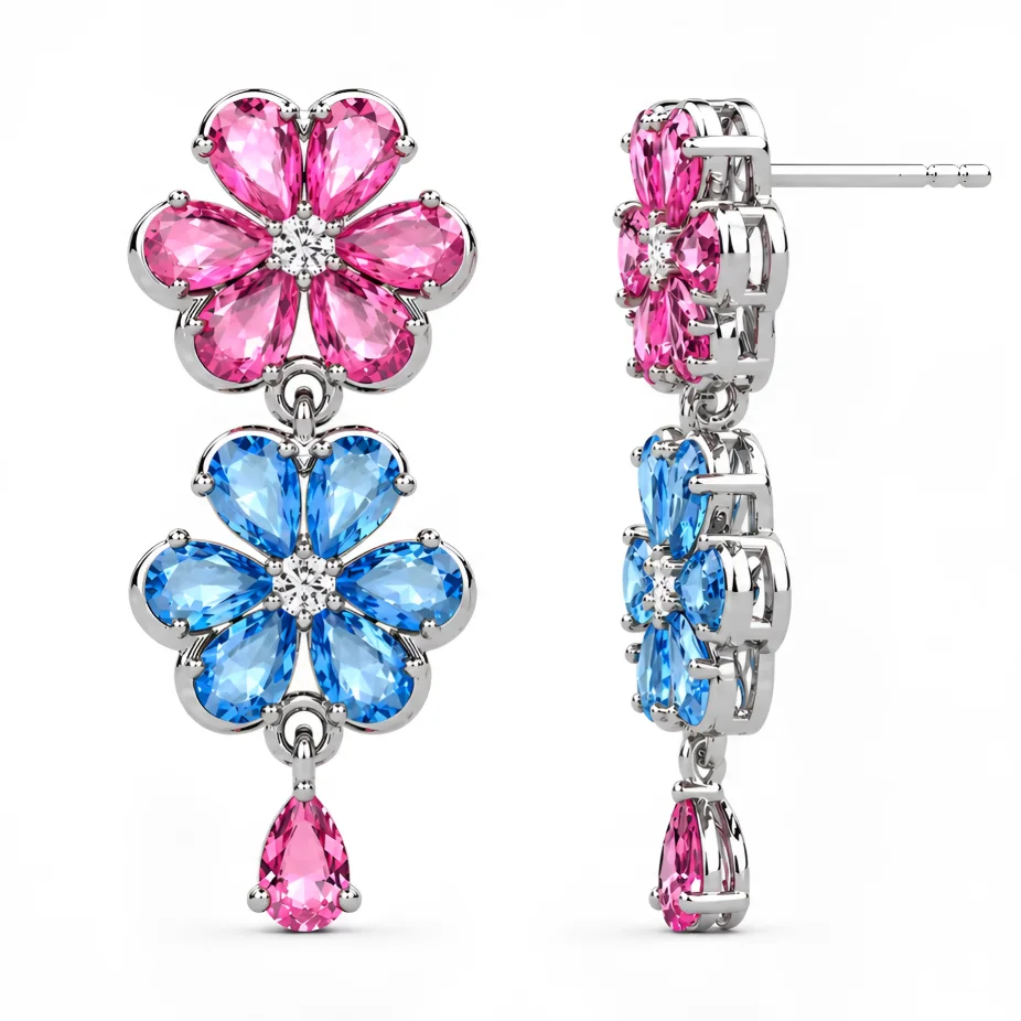 Crafted in 925 sterling silver with pure rhodium polish, these earrings feature a graceful twin-floral silhouette adorned with precision-cut premium crystals in vivid pink and luminous azure blue. Designed for rich, uniform color and crystal-like clarity, each petal reflects light with a soft, controlled brilliance.