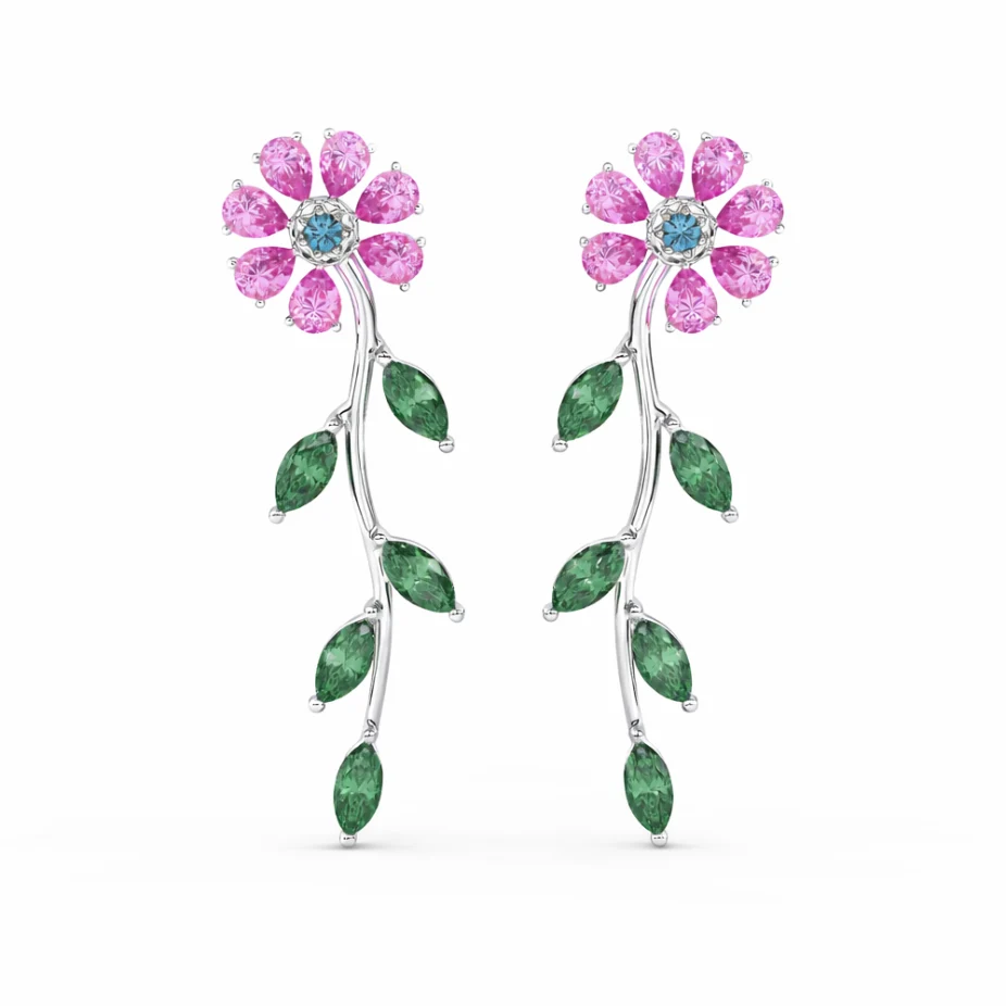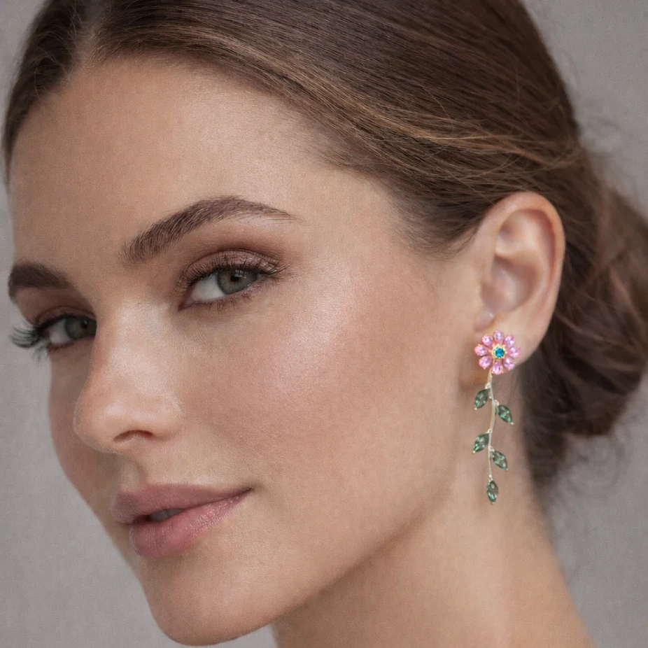 This harmonious combination of pink petals, green leaves, and a luminous blue center brings a vibrant yet refined charm to the earrings. The flowing silhouette adds movement and elegance, making them perfect for both everyday styling and special occasions.