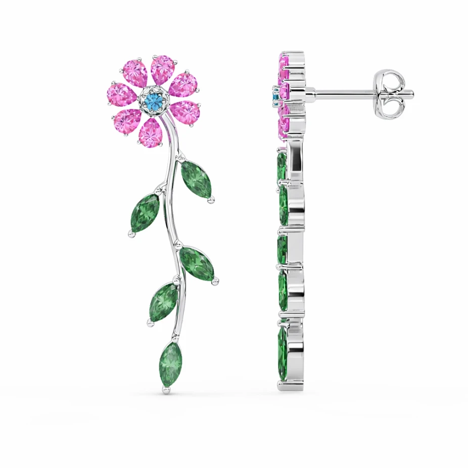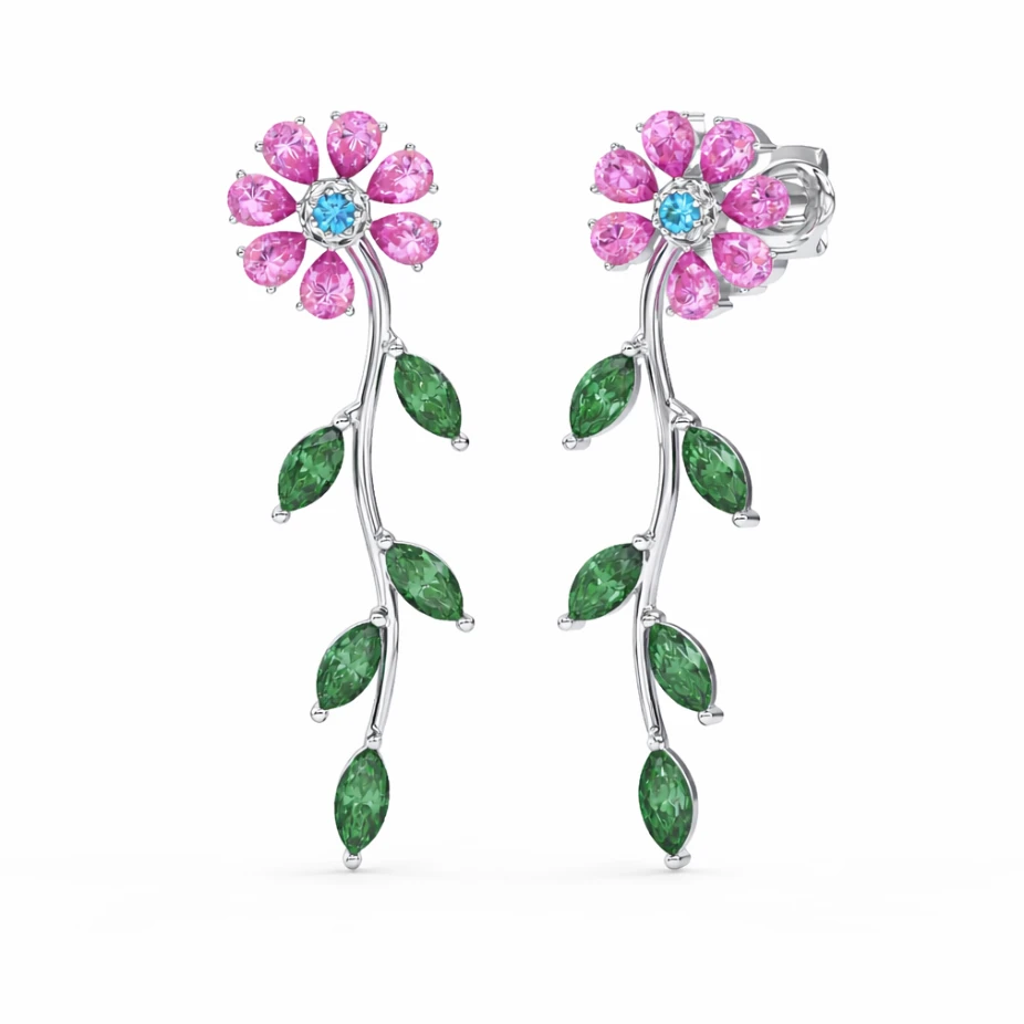 The design features a radiant floral motif at the top, formed by delicate pink gemstones surrounding a sparkling blue stone center. Extending gracefully downward, a slender vine-like structure is adorned with marquise-cut green gemstones, creating the appearance of fresh leaves growing along a natural stem.