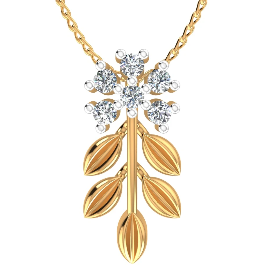 Delicate, graceful, and effortlessly elegant — this 18K gold pendant is a tribute to nature’s timeless beauty. A radiant cluster of Celestial Diamonds (lab-grown melee diamonds with VS–SI1 clarity and ideal cut, color, and polish) forms a shimmering blossom, perched above finely detailed gold leaves that cascade with organic rhythm.