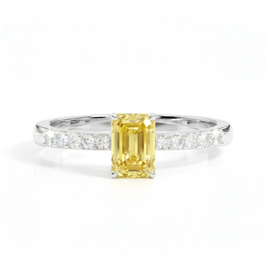 Radiant, rare, and crafted for those who adore luminous beauty — the Golden Aurora Ring pairs the cool brilliance of 18k white gold with the warm glow of a magnificent emerald-cut yellow diamond. Its elongated facets capture light like liquid gold, creating a sunrise-like brilliance that feels powerful yet delicate.
