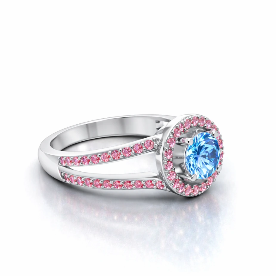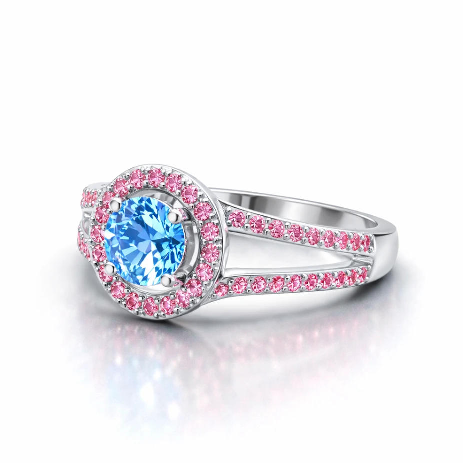 This ring is a vision of elegance with a bold twist. Crafted in 92.5 silver and finished with a pure rhodium polish for an enduring brilliance, it features a captivating ocean-blue center stone embraced by a halo and split band of delicate pink accents.