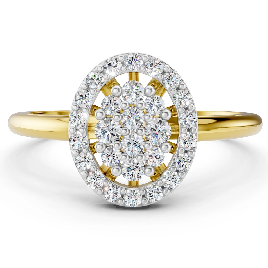 A sparkling constellation of lab-grown Celestial Diamonds rests in a graceful oval cluster, framed by a dazzling diamond halo. Set in radiant 18K yellow gold, the sleek band adds a touch of minimalism, making this piece perfect for both everyday wear and special moments. The interplay of geometry and shimmer creates a look that’s bold, balanced, and endlessly beautiful.