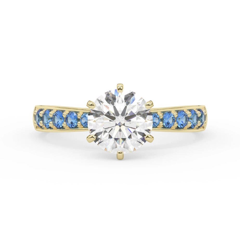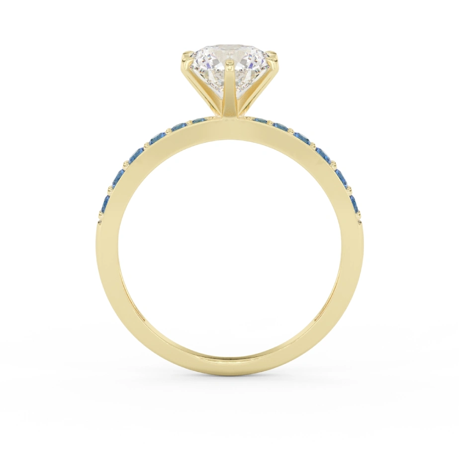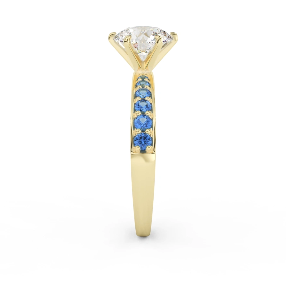 Illuminate your style with the Polaris Solitaire Ring, a masterpiece crafted in 18k gold and designed to shine as brightly as the guiding star it’s named after. At its heart sits a brilliant 1ct round solitaire — available in both lab-grown and natural diamonds — radiating pure white fire. Along the band, a trail of vivid blue gemstones adds celestial contrast, echoing the glow of stardust around Polaris in a midnight sky.