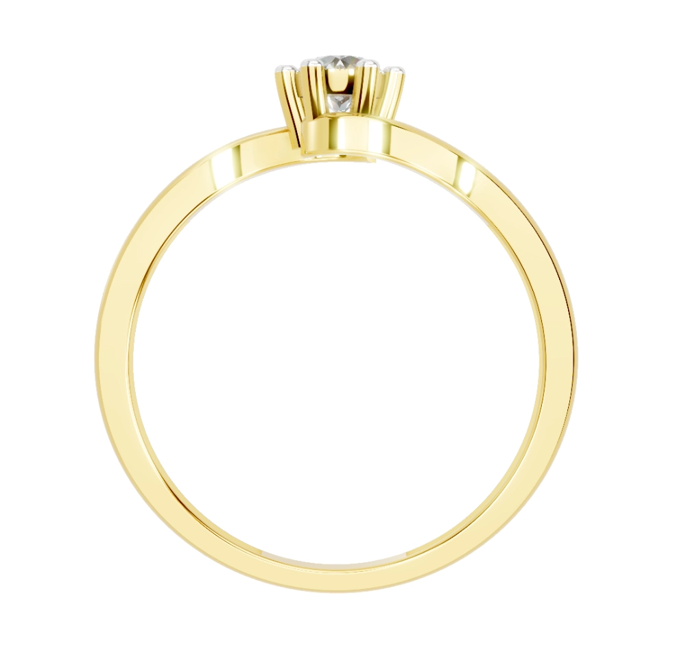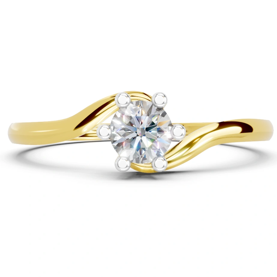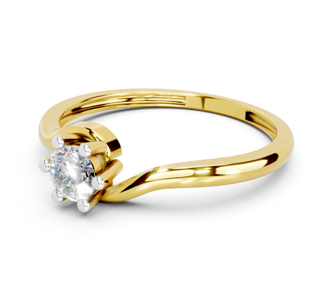 A delicate ripple of gold flows gracefully into a six-prong embrace, holding a radiant, sparkling Diamond at its heart. The band, sculpted in luminous 18K gold, curves with subtle sophistication, mirroring the gentle rhythm of eternal love.
