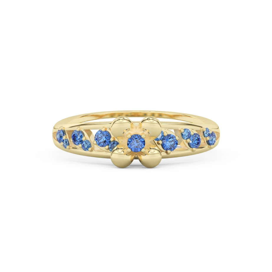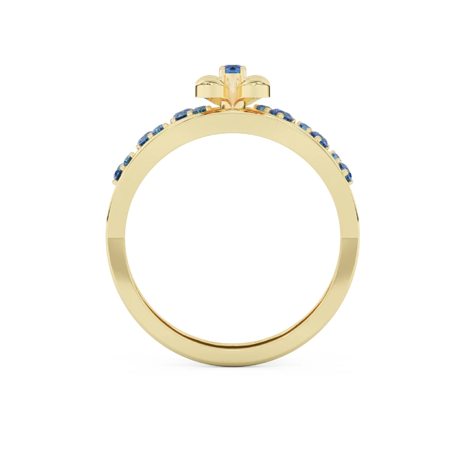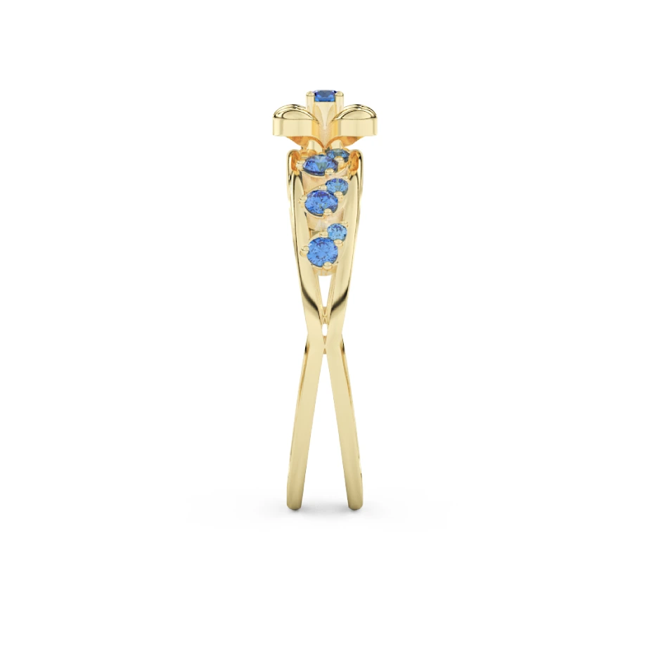 Bask in the tranquil elegance of the Aurium Temptation Ring, a poetic harmony of gold and blue. Crafted in 18K gold, this ring blossoms with a floral centerpiece surrounded by brilliant blue gemstones, radiating serenity and grace. The split shank design adds a touch of modern sophistication while maintaining its delicate feminine charm.