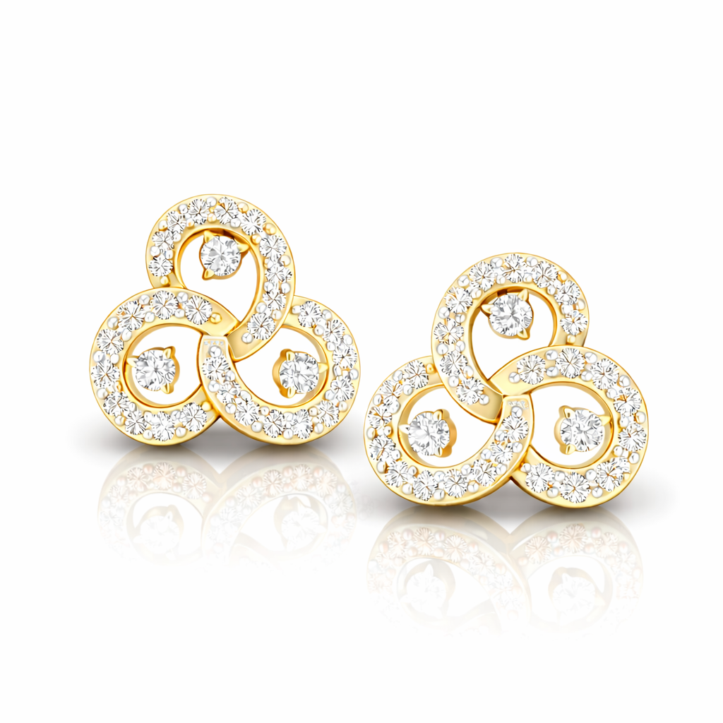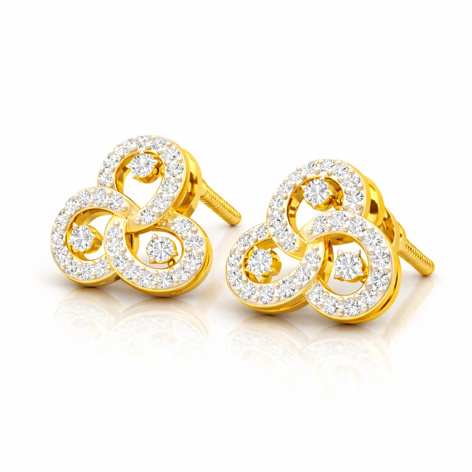 The Trinity Swirl Diamond Studs, crafted in 18k yellow gold and adorned with shimmering Celestial Diamonds (lab-grown, VS–SI1 clarity, excellent cut), these studs feature three interlocking swirls that embody unity, motion, and grace. Each swirl is delicately encrusted with pavé diamonds, culminating in a trio of pear-shaped diamonds nestled at the heart of the design—like floating stars within a golden cosmos.