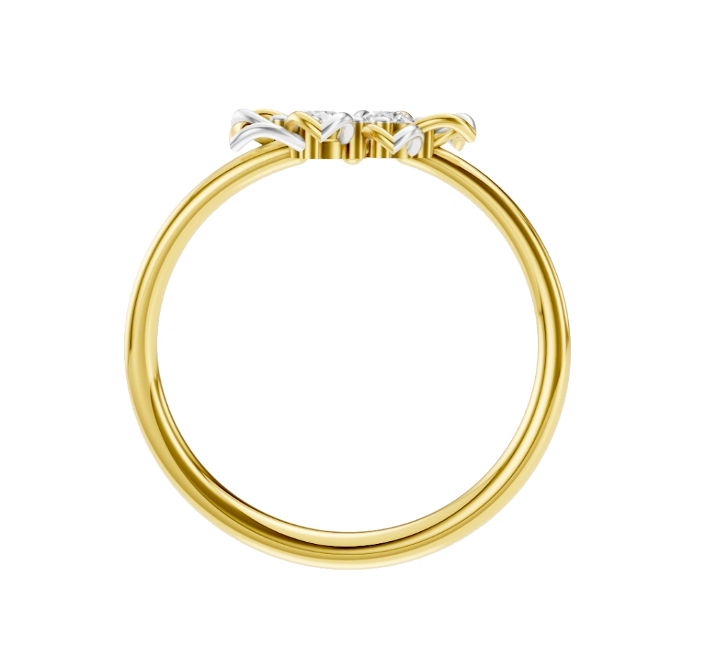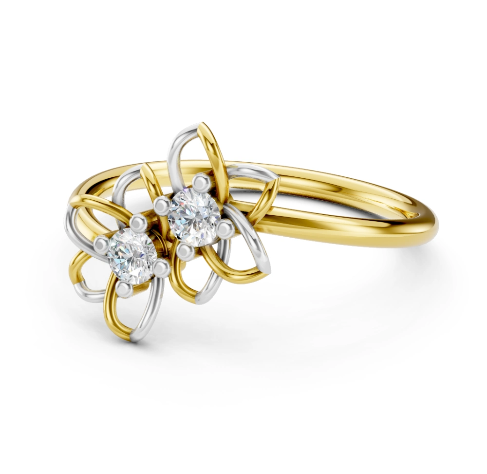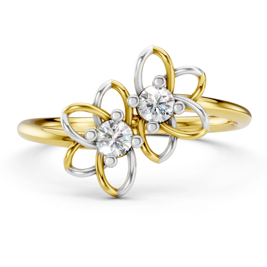 The Twin Bloom ring is a graceful ode to nature’s symmetry. Crafted in radiant 18k yellow gold, this lightweight beauty showcases twin floral motifs—each petal blooming with a perfect harmony of white and yellow gold, encircling two brilliant lab-grown Celestial Diamonds. Thoughtfully designed for everyday elegance, this piece celebrates love in its most effortless form. Diamond Quality: VS–SI1 minimum, with brilliant cut, color & polish.
